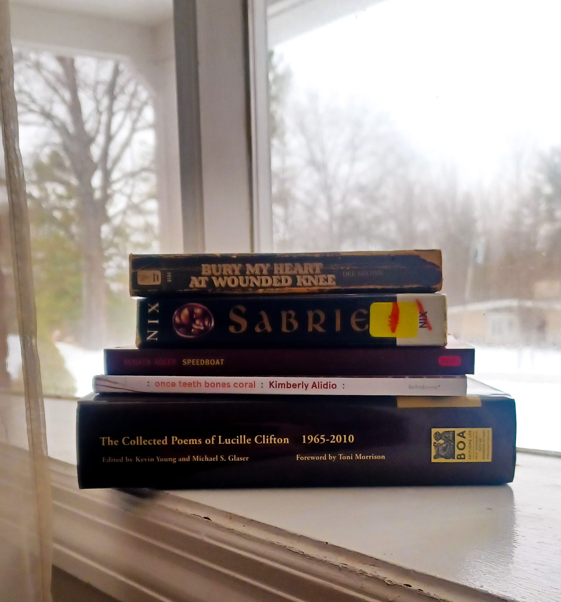 : once teeth bones coral : by Kimberly Alidio. This book is a wide-set volume with the words scattered into clusters strewn across the page. Lots of empty space, the poems a field that can be read in several directions, which I loved. Alidio allows the reader to float through, to marinate, to spend some time and it felt enlivening to draw out the connections between the constellations of words and phrases.